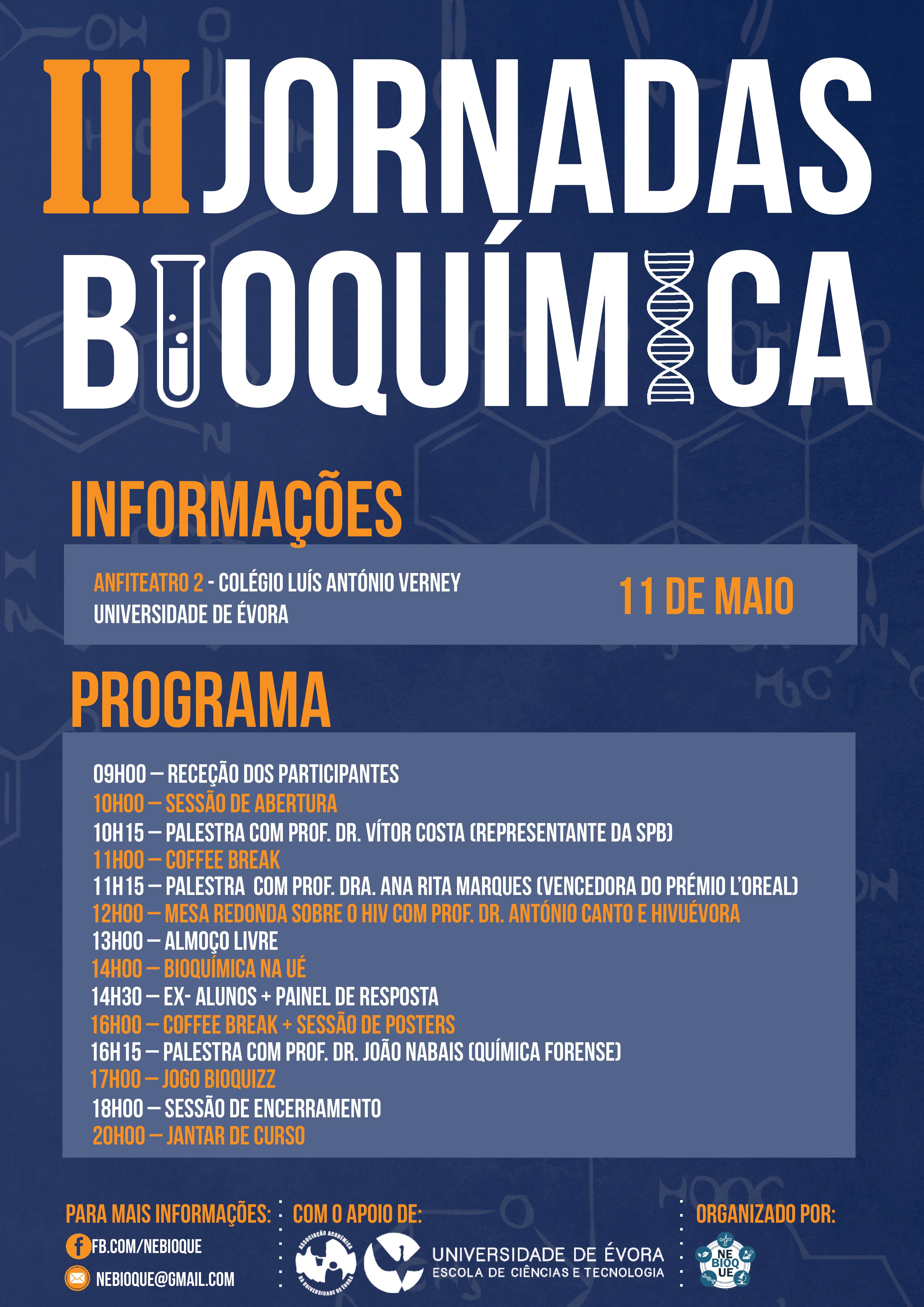 No próximo dia 11 de Maio pelas 9:00H, no Anfiteatro 2 do Colégio Luis António Verney, terão lugar as III Jornadas de Bioquímca.