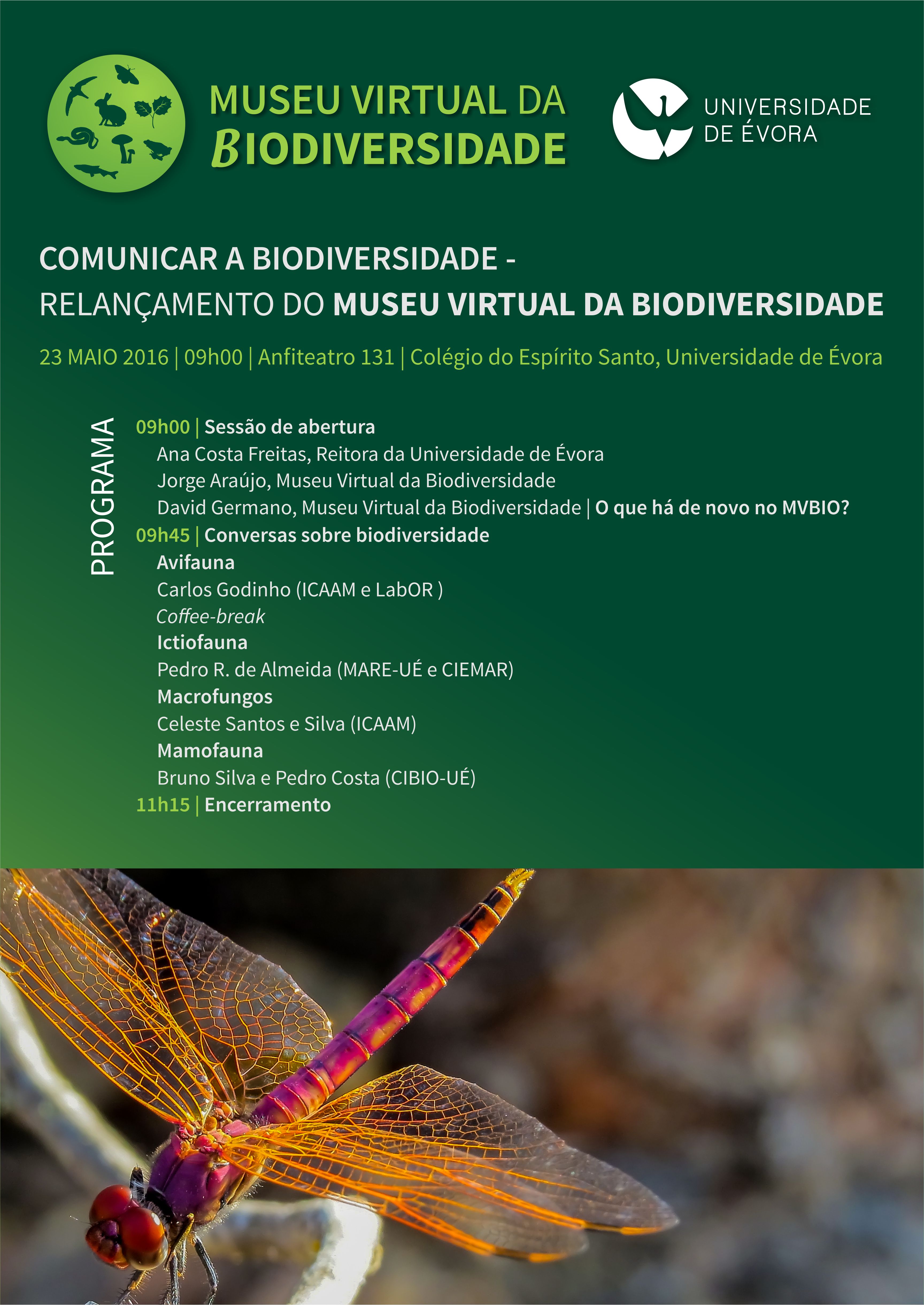 Orientado para o público escolar e académico-científico, o portal MVBio pretende tornar mais fácil a intuitivo o acesso ao conhecimento da biodiversidade portuguesa, promovendo um encontro para a apresemntação da sua nova imagem e valâncias disponíveis, enriquecido por diversas comunicações na área da biodiversidade ministradas por investigadores da Universidade de Évora